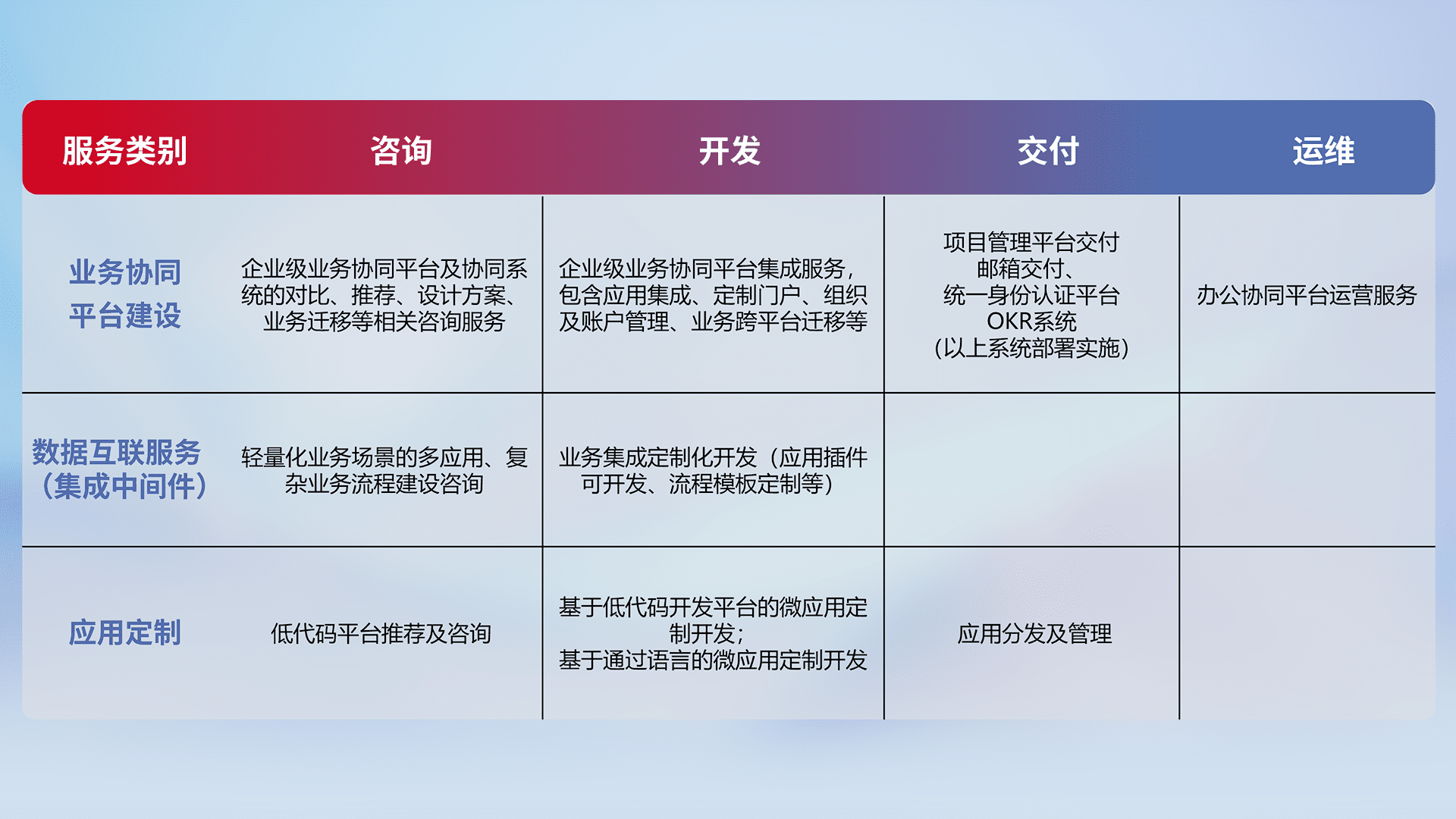 针对钉钉、、企微、、、IDaas等平台级产品提供产品的规划、、、方案、、、交付、、、、定制化开发等服务,,实现如统一协同办公、、、智能客户服务、、混合会议管理、、、、智能数据查询、、等业务场景,,,,实现数字化转型。。